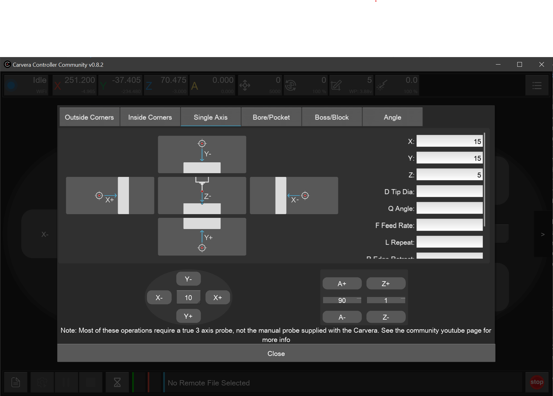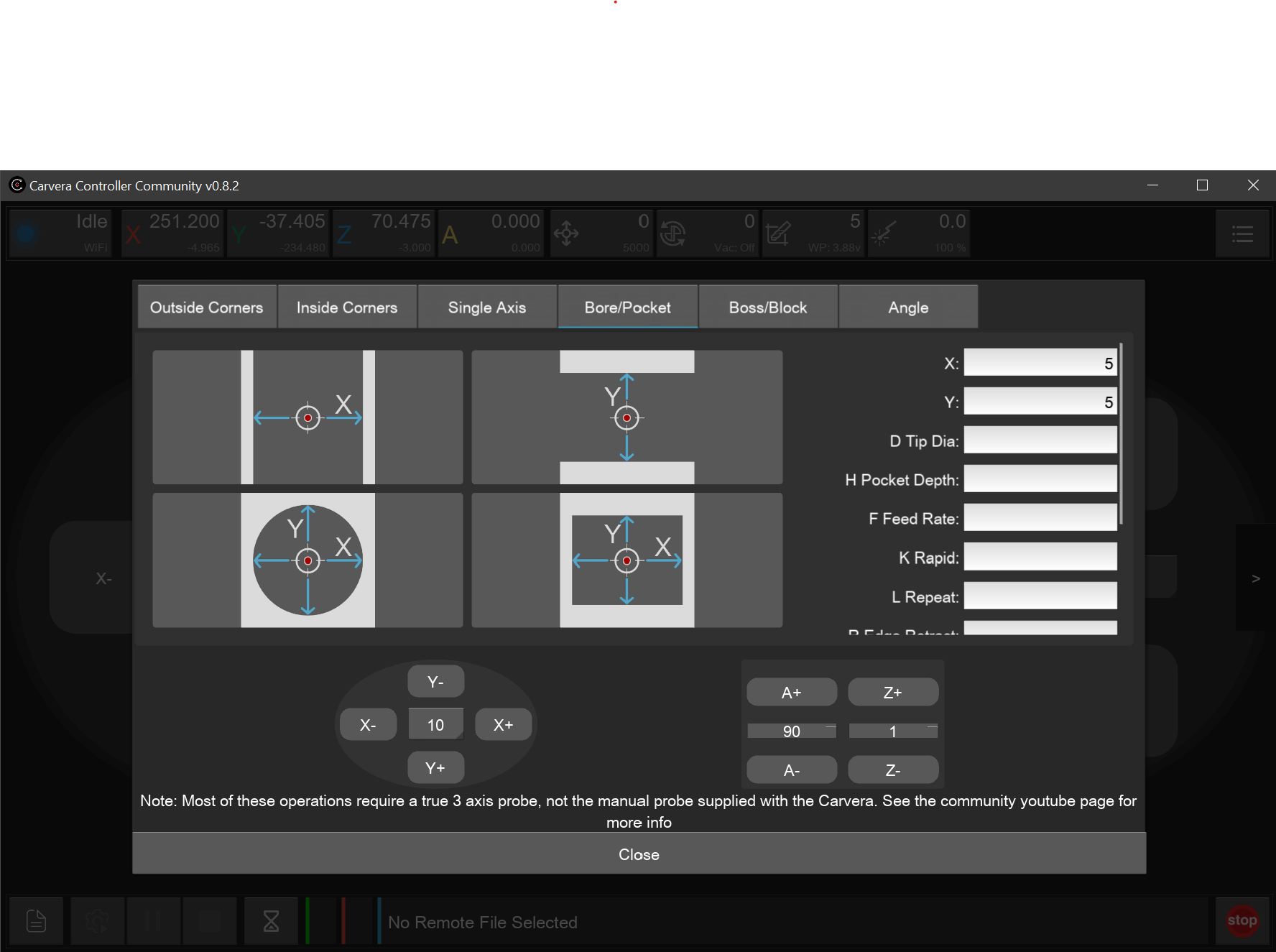 * **3-axis** and advanced **probing** UI screens for various geometries (**corners**, **axis**, **bore/pocket**, **angles**) for use with a [true 3D touch probe](https://www.instructables.com/Carvera-Touch-Probe-Modifications/) (not the included XYZ probe block)