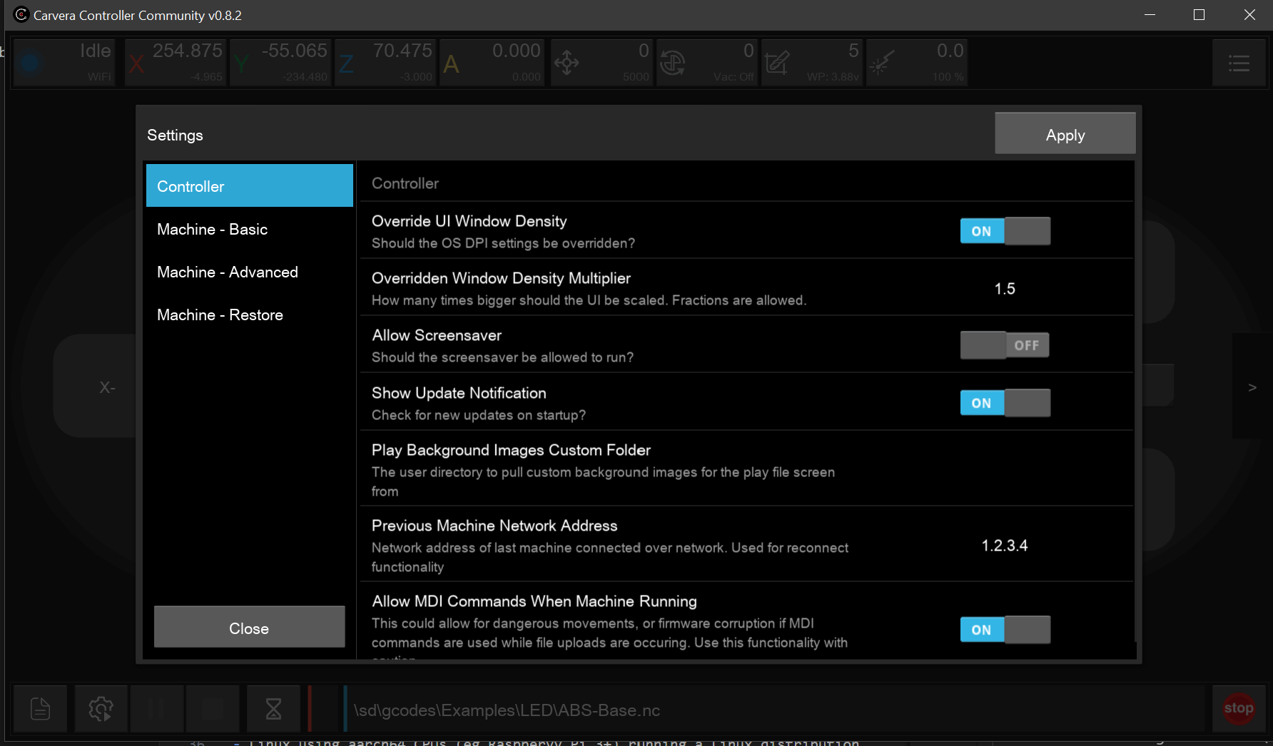 * **Controller config settings** (UI Density, screensaver disable, Allow MDI while machine running, virtual keyboard)