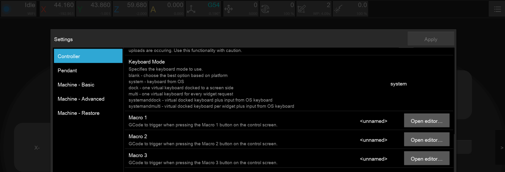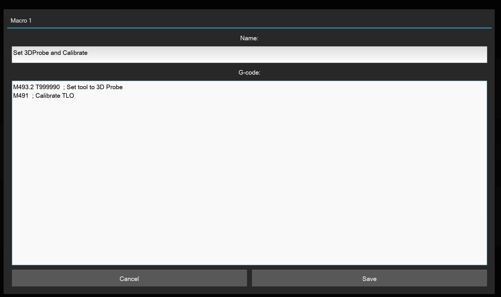 In the Macro Editor the macro name can be set as well as multiple lines of G-Code. Each new line is executed in sequence.