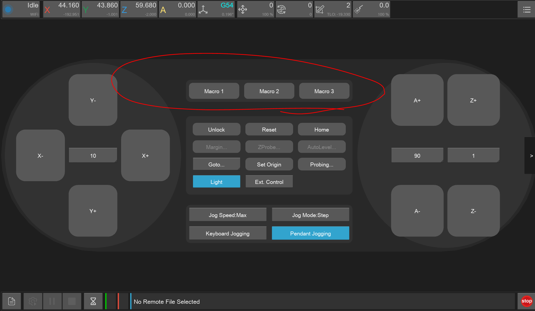 A row of macro buttons is present on the control panel screen for the operator to configure frequently used commands or small g-code programs.