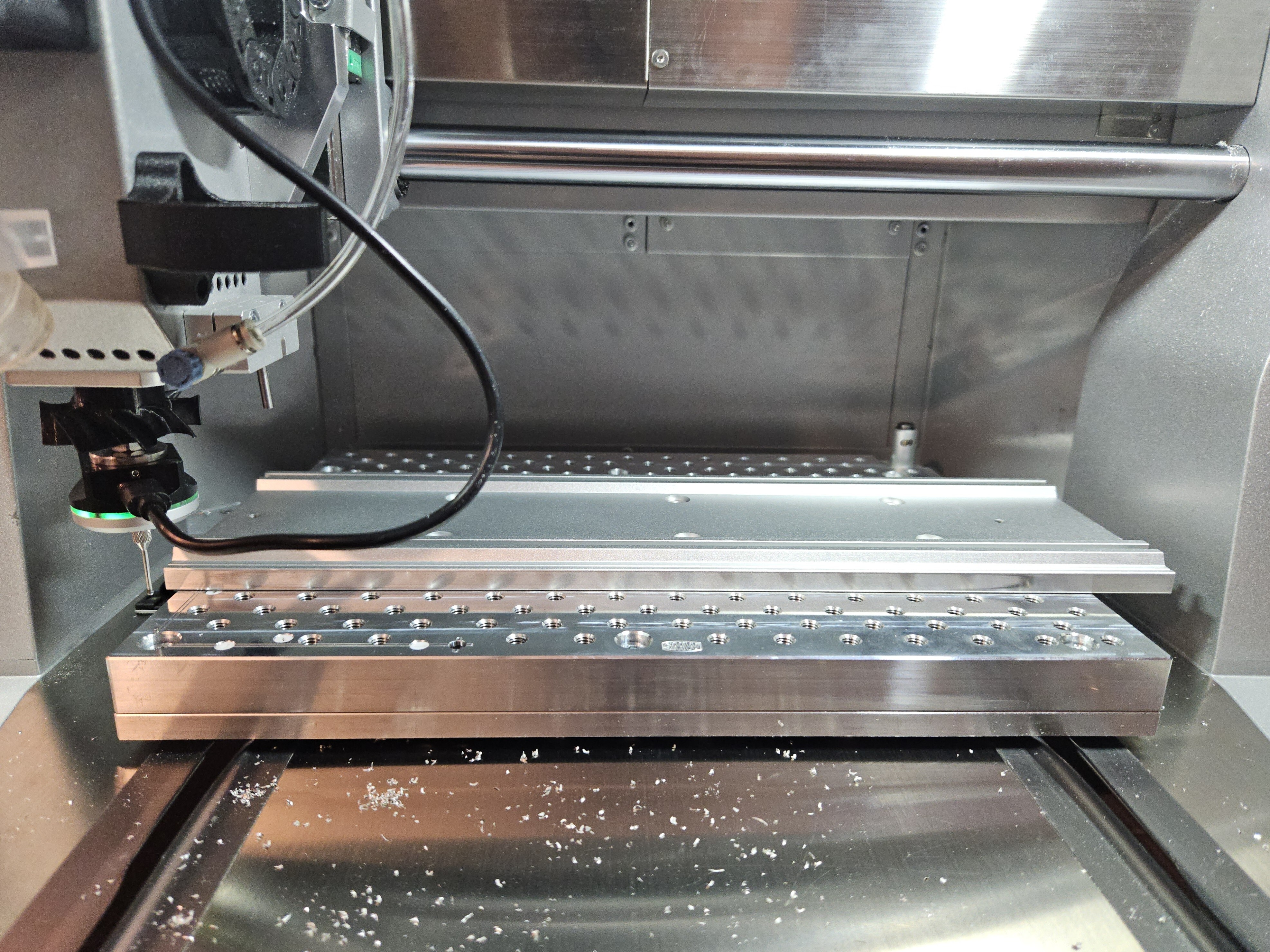 Put the reference geometry on the bed. If using the 4th axis baseplate, the plate is already aligned with dowel pins. If using something else, make sure to properly align it. Ideally the reference geometry exceeds the length of the bed (as the 4th baseplate does).